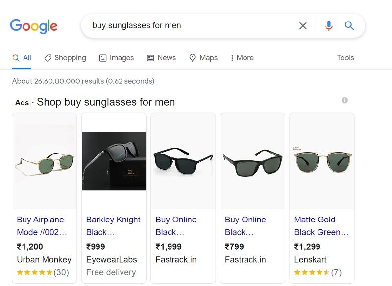 Let’s consider one of the Google Display Ads examples to help you understand how it works. A while back, I wanted to buy some sunglasses and thought of looking up for the same on Google. Now, when I entered a keyword like “sunglasses for men”, I first got a list of some promoted ads on the top.