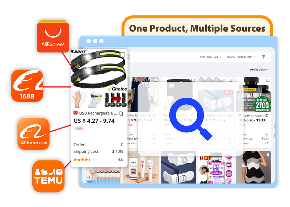 All-in-One Sourcing: Access millions of products from AliExpress, Temu, 1688, and Alibaba in one single dashboard. Image Search: Found a product image? Instantly search across all platforms to find the original supplier on 1688 or Temu. One-Click Import: Push products from any supplier directly to your Shopify or Wix store with a single click.